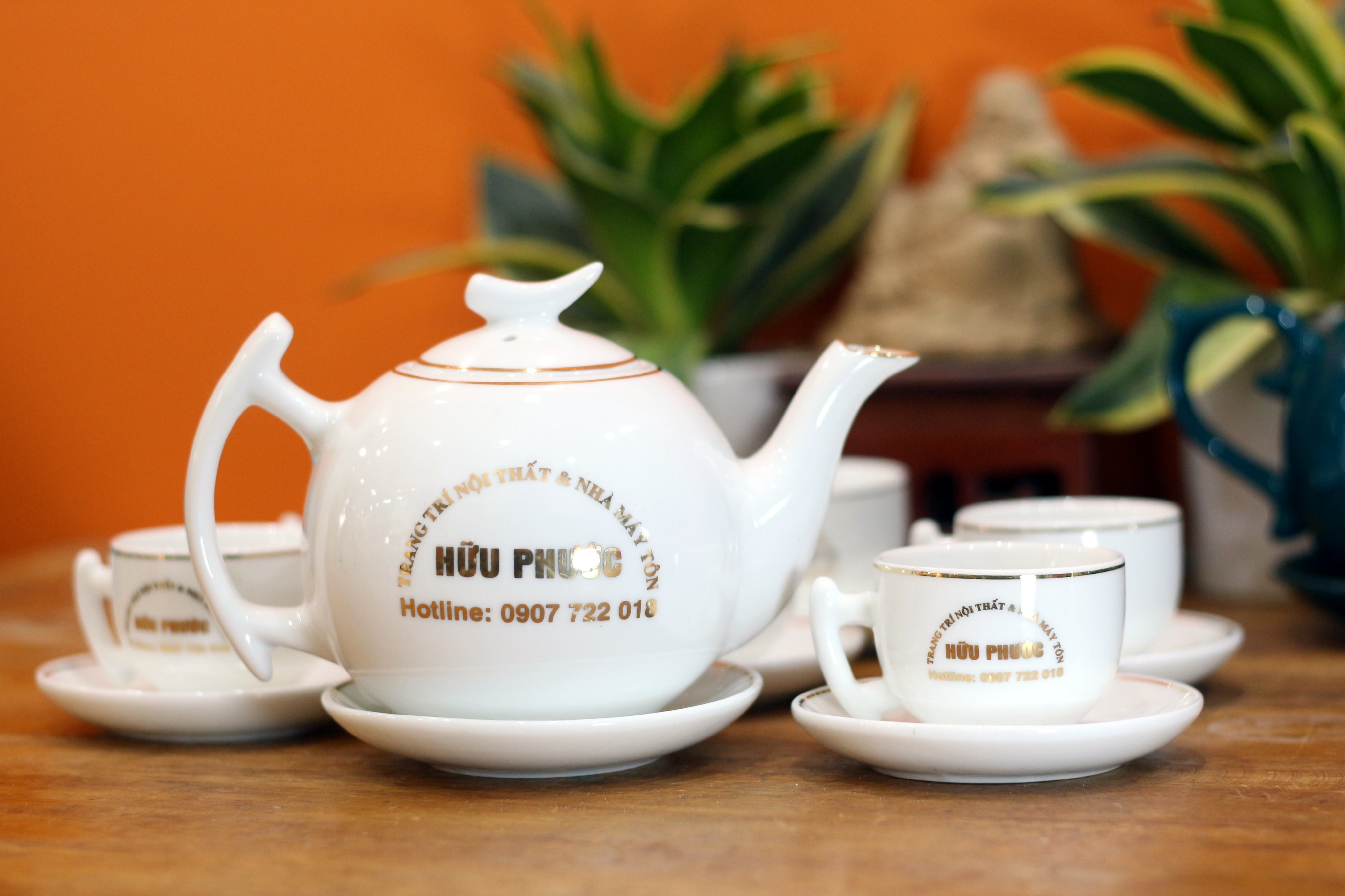 - Bộ ấm chén trà giá rẻ ( bộ ấm chén Bát Tràng ) in logo làm quà tặng thương hiệu cho doanh nghiệp.