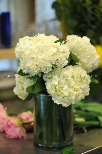 Bắt đầu cắm hoa, bạn cắm những cành tú cầu ở những độ cao khác nhau (3 cành cao và 3 cành thấp).